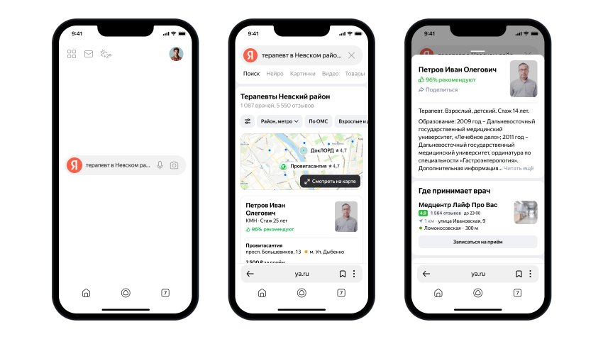 Яндекс объединил информацию о более чем 740 тысячах врачей России, чтобы пользователи Поиска могли быстро выбрать нужного им специалиста. Сведения о докторах появляются прямо в результатах Поиска в виде карточек, когда пользователь ищет врача определённой специализации, например: «ЛОР Адмиралтейский район». Чтобы записаться на приём было ещё проще, можно найти ближайшую клинику или врача на карте