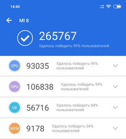 Нагрев есть, но критичным назвать его нельзя. А если надеть на смартфон комплектный защитный чехол, то потепления и вовсе не ощущается. Для галочки мы запустили на Mi 8 синтетический текст AnTuTu. В нем смартфон набрал 265 тысяч баллов, еще раз подтвердив наши наблюдения.