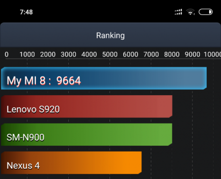 В синтетическом тесте AnTuTu Tester Mi 8 набрал почти 10?000 баллов — результат выше среднего. Для сравнения: еще один топовый смартфон Xiaomi Mi Mix 2S с таким же аккумулятором (на 3400 мАч) и почти идентичными техническими характеристиками в этом же тесте показал результат в 7 000 баллов.