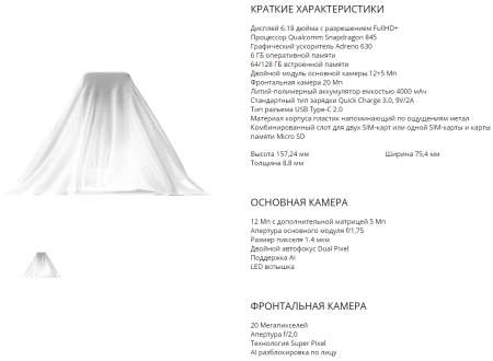 В xistore утверждают, что получить смартфон можно будет уже 17 августа (по обновленной информации на сайте — 1 сентября). По сведениям магазина, гаджет получит IPS-экран на 6,18 дюйма разрешением Full HD+, процессор Snapdragon 845, графику Adreno 630, 6 ГБ оперативной и 64/128 ГБ встроенной памяти. Физические размеры гаджета — 157,24?75,4?8,8 мм.