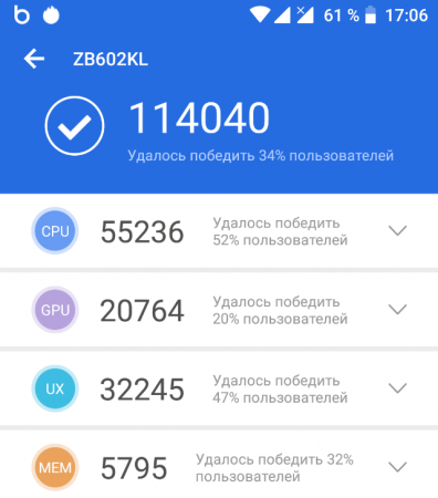 В тесте AnTuTu результат аппарата составляет 114 тысяч баллов. Подобного значения сегодня хватит для абсолютно всех задач — от серфинга в Сети с десятком открытых вкладок до современных игр на максимальных настройках графики. Та же Asphalt 9 идет без проблем, заметных просадок fps мы не заметили.