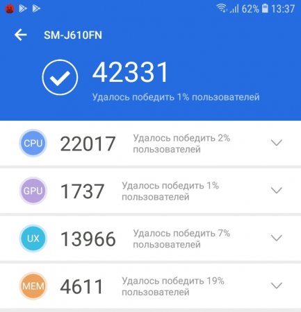 По современным меркам, производительность Galaxy J6+ оставляет желать лучшего. Смартфон работает на процессоре Snapdragon 425 и оснащается 3/32 ГБ памяти. В AnTuTu гаджет набирает чуть больше 40 тысяч баллов (результат ниже среднего).