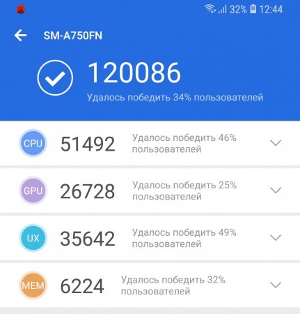 С Galaxy A7 (2018) все намного лучше. Устройство базируется на фирменном процессоре Exynos 7885 вместе с 4 ГБ оперативной и 64 ГБ постоянной памяти. Подобная связка набирает в AnTuTu 120 тысяч очков. Этого более чем достаточно для любых задач.