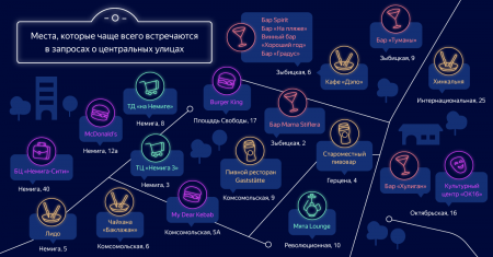Аналитики "Яндекса" посмотрели, какие заведения и адреса пользователи упоминают в поисковых запросах вместе с названиями центральных улиц Минска — Герцена, Зыбицкой, Интернациональной, Комсомольской, Карла Маркса, Ленина, Немиги, Октябрьской и Революционной.
