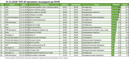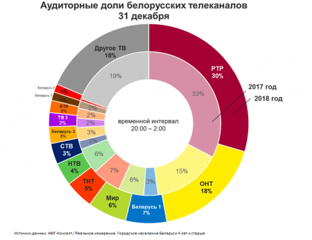 Самыми популярными телеканалами 31 декабря, как и годом ранее, стали РТР-Беларусь и ОНТ — их суммарная доля составила 36% за весь день, а в интервале с 20.00 до 2.00 — 48%, то есть почти половина времени просмотра в новогоднюю ночь пришлась на эти два телеканала.
