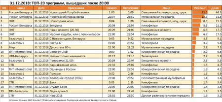 После 20.00 интерес зрителей сместился в сторону музыкальных шоу (половина мест в топ-10), лидерами среди которых стали «Новогодний голубой огонек» и «Новогодний парад звезд» на РТР-Беларусь, а также «Новогодняя ночь» на телеканале ОНТ, которые смотрело 44%, 31% и 21% телезрителей соответственно. Кроме них в лучшую пятерку вечерних программ вошли фильм-сказка «Золушка» на телеканале РТР-Беларусь с участием Сергея Лазарева и Натальи Медведевой, а также итоговые «Наши новости» на ОНТ.