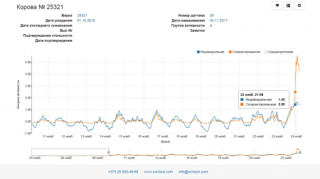 А еще в датчики Ovi-bovi встроены NFC-сенсоры — если коснуться их смартфоном, на нем сразу же откроется веб-страница коровы, связанной с этим датчиком. А вот как выглядит детализированная информация об активности каждой коровы с пятиминутным интервалом: