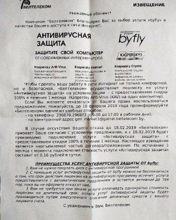 Чуть больше месяца назад абоненту «Белтелекома» из Новогрудка пришло извещение, в котором говорилось об автоматическом подключении антивируса «Лаборатории Касперского». В письме написано: подключение бесплатное. И ниже курсивом: по истечении месяца — стопроцентная оплата. Недавно схожее извещение получил абонент из Гомеля. Мы спросили у юриста, по закону ли это.