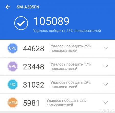 В AnTuTu такая связка набирает чуть больше 105 тысяч очков — неплохой результат для смартфона из среднего ценового диапазона. На таком «железе», скорее всего, получится запустить все современные игры, но не всегда на максимально возможных настройках графики. Мощности видеочипа Mali-G71 MP2 для этого немного не хватает.