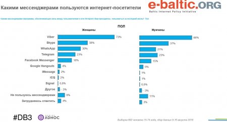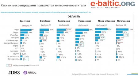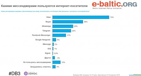 Абсолютным лидером в Беларуси является Viber — 70%. Затем идут Skype — 38%, WhatsApp — 25%, Telegram — 23% и Facebook Messenger — 17%. При этом 10% опрошенных ответили, что не пользуются мессенджерами.