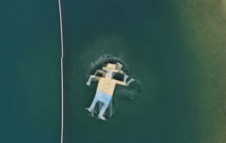 В воде рядом с австралийским городом Голд-Косте виден огромный человек. На самом деле это плавающий понтон для детей, который является частью небольшого парка развлечений на берегу.
