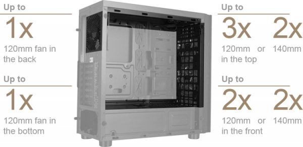 В общей сложности в корпусе можно расположить до семи вентиляторов. Кроме того, допускается применение жидкостной системы охлаждения с радиатором типоразмера 120 или 240 мм.