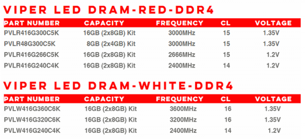 Ориентируясь, прежде всего, на экономную публику, Patriot прибегла к одноцветной подсветке модулей. Решения с более высокой средней производительностью получили белые светодиоды, а альтернативные комплекты с частотами пониже — красные. Маркировка наборов Viper LED White начинается с «PVLW», а Viper LED Red — соответственно, с «PVLR». Из-за нынешней высокой стоимости микросхем DDR4 стратеги Patriot решили обойтись выпуском двухканальных комплектов общим объёмом 8 и 16 Гбайт. Все модули охлаждаются невысокими алюминиевыми радиаторами с несколькими светодиодами в верхней части. Габариты каждого из устройств Patriot Viper LED White/Red составляют 135,7(Д) ? 7(Ш) ? 44,4(В) мм.
