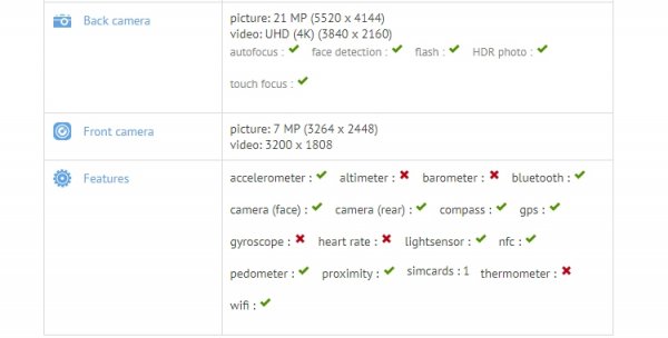Тест указывает на то, что аппарат наделён дисплеем размером 5,2 дюйма по диагонали. Панель обладает разрешением Full HD — 1920 ? 1080 точек. В тыльной части установлена 21-мегапиксельная камера со вспышкой. Лицевая камера полагается на 8-мегапиксельный сенсор.