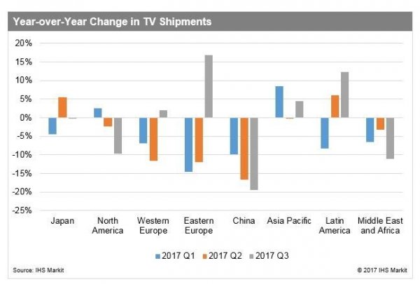 По оценкам аналитиков, в июле–сентябре 2017 года производители отгрузили в общей сложности 54,8 млн телевизоров, что на 5 % меньше, чем годом ранее. При этом выручка на рынке поднялась на 1 %, и этот подъём оказался первым с 2014 года.