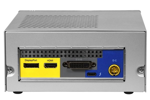 Для подключения бокса к компьютеру служит коннектор USB Type-C (Thunderbolt 3). Для подсоединения дисплеев есть три разъёма — порты Dual-Link DVI-D, HDMI 2.0 и DisplayPort 1.4.