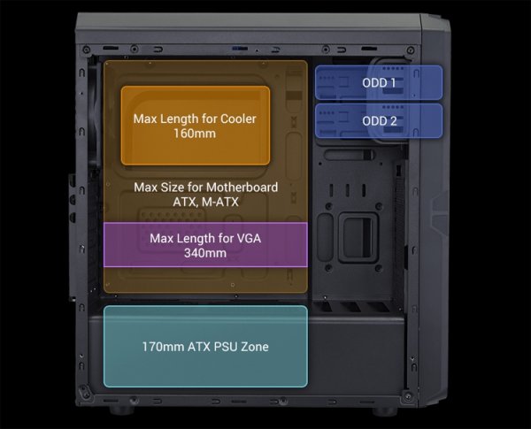 Ограничение по длине дискретных графических ускорителей составляет 340 мм. Высота процессорного охладителя не должна превышать 160 мм, а длина блока питания — 170 мм.