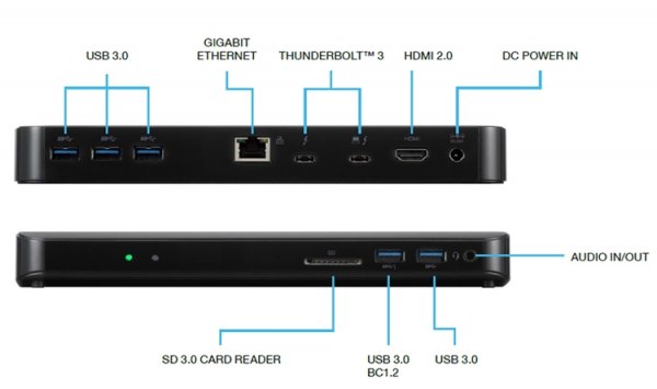 Станция наделена пятью разъёмами USB 3.0 Type-A, сетевым портом Gigabit Ethernet, стандартным аудиогнездом, коннектором HDMI 2.0, а также ридером SD-карт.