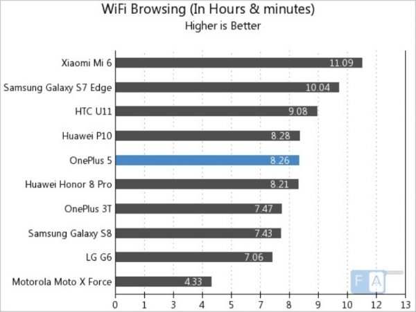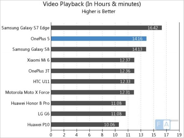 Без внимания не остались и показатели автономности OnePlus 5T, которые пусть и далеки от идеала и желаемого значения, но согласно информации от журналистов FoneArena, превосходят значения основных конкурентов или соответствуют им.
