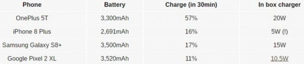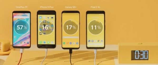Наглядно продемонстрировать эффективность Dash Charge разработчики OnePlus решили методом простого эксперимента, в ходе которого OnePlus 5T, а также iPhone 8 Plus, Samsung Galaxy S8 Plus и Google Pixel 2 XL были одновременно поставлены на зарядку. Уже через 30 минут OnePlus 5T хватило бы на умеренную эксплуатацию в течение последующих суток: индикатор заряда батареи смартфона остановился на значении 57 %. Китайский гаджет набрал около 55 % за полчаса, в то время как его оппоненты завершили испытание с результатом в диапазоне от 11 % до 17 %.
