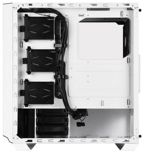 Корзины для крепления SSD находятся за поддоном для материнской платы. Ниже видны лотки для жёстких дисков, вместо которых можно установить ещё три 2,5-дюймовых устройства.