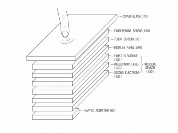 Новый патент, впрочем, указывает на то, что Samsung продолжает исследования в области интеграции дактилоскопического сканера в зону экрана. Как видно на иллюстрации, сопровождающей документ, слой, отвечающий за регистрацию отпечатков пальцев, должен располагаться сразу под защитным стеклом — над сенсором прикосновений.