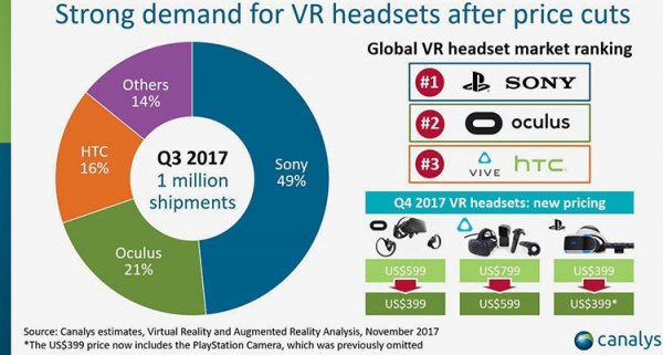 После того, как Oculus временно снизила летом стоимость Rift до $400, продажи рванули вперёд, и теперь компания решила сделать эту цену постоянной. Успех Sony обусловлен высокой популярностью VR на родном для неё японском рынке. «Sony имеет все шансы воспользоваться этим растущим интересом к VR, — заявил аналитик Canalys Джейсон Лоу (Jason Low). — Она доминирует на японском рынке VR-гарнитур с момента выхода PS VR, занимая более 80 процентов, и будет продолжать лидировать, поскольку наращивает поставки шлемов в комплекте с новыми играми популярных серий вроде Doom, Skyrim и Gran Turismo».