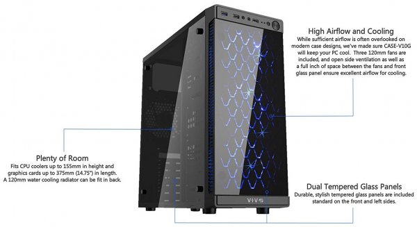 Собственно, бюджетных моделей Mid-Tower, с ценником $47,99 (как у V10G) и ниже сегодня хоть пруд пруди. Тем не менее новинка выделяется из общей массы своим внешним видом и наличием в комплекте поставки сразу трёх 120-мм вентиляторов с синей подсветкой. Лицевая и левая боковая панели Vivo Case-V10G изготовлены из тонированного закалённого стекла.