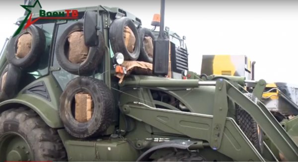 На кадрах можно заметить погрузчик, защищенный мешками со строительными смесями, многоцелевой транспортер МТ-ЛБ с бортами, закрытыми ящиками с пеcком, несколько БМП-2, защищенных решетками, ящиками с песком, автомобильными покрышками и мешками с сыпучей смесью.