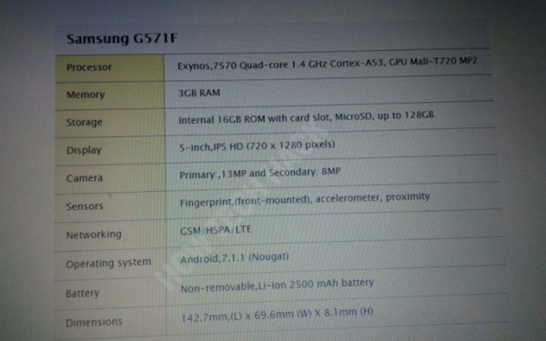 В ноябре мы сообщали, что компания Samsung готовит к выпуску смартфон среднего уровня Galaxy J5 Prime (2017). Теперь в распоряжении сетевых источников оказались технические характеристики этого аппарата. Информация размещенная на сайте - «print-prime.ru» Сообщается, что новинка наделена 5-дюймовым сенсорным дисплеем, а не 4,8-дюймовым, как предполагалось ранее. При этом разрешение составляет 1280 ? 720 точек, что соответствует формату 720р. Применён доморощенный процессор Exynos 7570, который объединяет четыре вычислительных ядра ARM Cortex-A53 с тактовой частотой до 1,4 ГГц и графический ускоритель Mali-T720. Присутствует сотовый модем LTE Category 4, обеспечивающий скорость загрузки данных до 150 Мбит/с. Чип функционирует в тандеме с 3 Гбайт оперативной памяти. В тыльной части установлена камера с 13-мегапиксельным сенсором. Фронтальная камера полагается на 8-мегапиксельный датчик. В лицевой части располагается дактилоскопический сканер для считывания отпечатков пальцев. Флеш-модуль рассчитан на хранение 16 Гбайт информации. Дополнительно можно установить карту microSD вместимостью до 128 Гбайт. За питание отвечает аккумуляторная батарея ёмкостью 2500 мА·ч. На смартфон установлена операционная система Android 7.1.1 (Nougat). Габариты составляют 142,7 ? 69,6 ? 8,1 мм. Анонс новинки ожидается в ближайшее время.