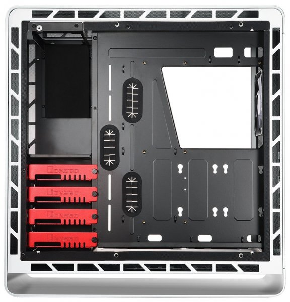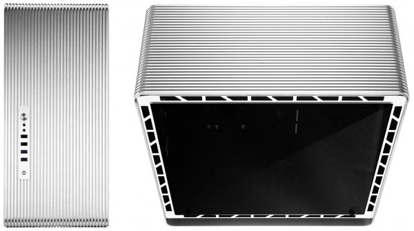 Внутреннее пространство UMX5 разделено на два вертикальных отсека. В основном отсеке поместятся материнская плата форм-фактора ATX, Micro-ATX или Mini-ITX, узлы систем охлаждения процессора и видеокарты, и корпусные вентиляторы. По соседству «с потолка» будет свисать ATX-совместимый блок питания, а ниже него расположатся накопители — максимум четыре 3,5-дюймовых или шесть 2,5-дюймовых.