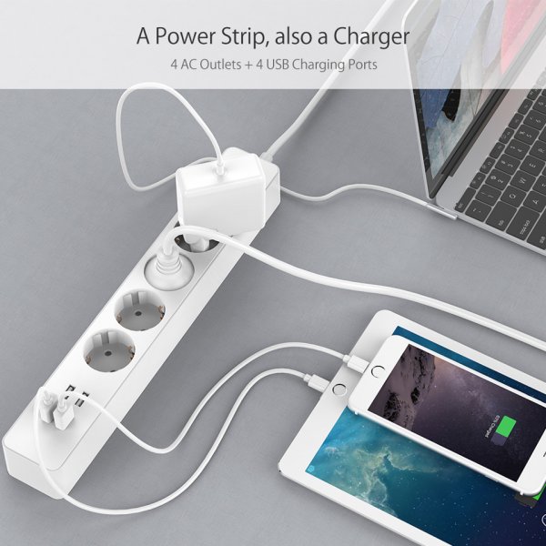 Удлинитель включает четыре универсальные розетки европейского типа, а также четыре USB-порта с поддержкой зарядки 5V/2.4A. Суммарная мощность на четыре USB-разъема не превышает 20 Вт, максимальная мощность нагрузки составляет 2500 Вт.