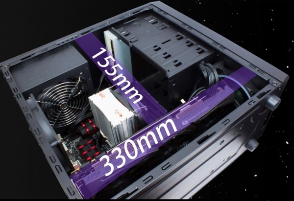 Новинка, выполненная в чёрном цвете, имеет габариты 390 ? 180 ? 375 мм. Допускается монтаж четырёх карт расширения: в частности, можно установить дискретный графический ускоритель длиной до 330 мм.