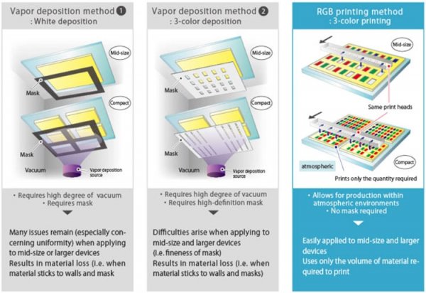 Японские компании, как и их конкуренты из Южной Кореи и с Тайваня, давно изучают возможность использования струйной печати при производстве LCD- и OLED-панелей. В ряде случаев для выпуска LCD-экранов струйная печать использовалась при создании RGB-светофильтров. Для производства OLED на основе материалов из органических соединений струйная печать позволяет печатать даже светодиоды, поскольку органика используется в виде растворов. К тому же, струйная печать легко масштабируется, достаточно только увеличить ширину печатающей головки, тогда как традиционный метод изготовления OLED с помощью осаждения в вакууме из газовой среды требует фотошаблонов и специальных камер.