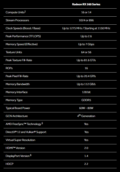 Поскольку на странице Radeon RX 560 на gaming.radeon.com вовсе не упоминается модель RX 560D с 896 шейдерными и 56 текстурными блоками, можно сделать вывод, что «плавающие» прикладные характеристики — не её либо не только её атрибут. Также заметим, что пропускная способность памяти «до 7 Гбит/с» на контакт оставляет AIB-партнёрам AMD лазейку для дополнительного снижения производительности. Диапазон энергопотребления в 60–80 Вт и ряд других параметров указывались для Radeon RX 560 и прежде.