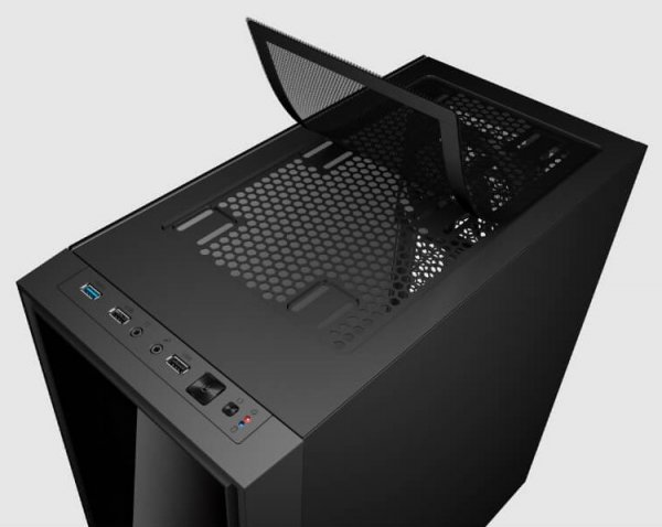 Помимо трёх 120-мм вентиляторов с подсветкой, на задней панели имеется ещё один 120-мм «карлсон» с обычной крыльчаткой — без светодиодов. Вентиляционные отверстия наверху накрыты магнитной сеткой-фильтром. На панели ввода-вывода находятся разъёмы USB 3.0, USB 2.0 (2 шт.), гнёзда Mini-Jack для наушников и микрофона, кнопки Power и Reset.