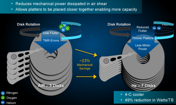 Как известно, плотность гелия в семь раз ниже плотности воздуха, что уменьшает силу трения, действующую на магнитные пластины внутри дисков, а также снижает силу газовых потоков, которая воздействует на точность позиционирования головок и пластин. Как следствие, заполненные гелием жёсткие диски потребляют меньше энергии, чем обычные «воздушные» HDD. Так, энергопотребление Toshiba MG07ACA во время операций чтения и записи составляет 7,6 Вт, тогда как в режиме ожидания — 4,6 Вт. Таким образом, энергопотребление новых HDD примерно соответствует «гелиевым» накопителям Seagate, но превышает таковое у заполненных гелием жёстких дисков производства Western Digital. Между тем энергопотребление 4,6 Вт в режиме ожидания является самым низким среди жёстких дисков большой ёмкости корпоративного класса. Если рассматривать показатели вроде эффективности энергопотребления в режиме ожидания (жёсткие диски большого объёма проводят много времени в таком режиме, поэтому метрика имеет смысл), то 14-Тбайт винчестер Toshiba является бесспорным чемпионом, потребляющим всего 0,32 Вт на Тбайт.