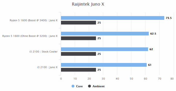 Тесты обычной версии кулера Juno X, проведённые ресурсом HardwareCheck, показали, что данная модель демонстрирует эффективность на уровне штатной СО процессора Core i3-2100 (65 Вт). Кроме того, она без проблем охлаждает 65-ваттный Ryzen 5 1600.