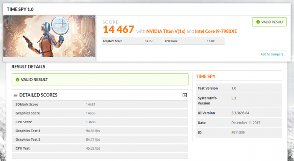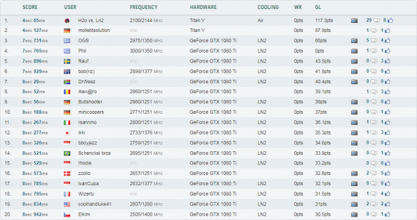 Менее уверенно новичок показал себя в бенчмарке 3DMark Time Spy, в котором высокая частота решений на различных модификациях чипа Pascal GP102 пока ещё имеет вес. Мастер разгона Molletitsolution и его экземпляр TITAN V разместились на третьем месте в табели о рангах с результатом 14 467 очков. Оверклокеры K|ngp|n (15 004 очка) и Rauf (14 700 очков) остались впереди за счёт того, что их видеокарты GeForce GTX 1080 Ti функционировали на частотах свыше 2,7 ГГц (под жидким азотом).