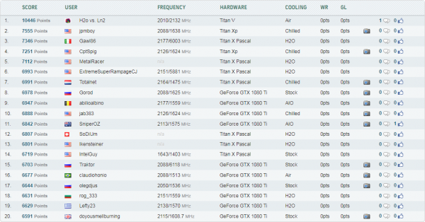 В другом «измерении» NVIDIA TITAN V находится и в дисциплине Unigine Superposition. На предустановке 1080p Extreme оверклокер H2o vs. Ln2 улучшил предыдущий рекорд соотечественника Jpmboy, в распоряжении которого был «только» TITAN XP, почти на три тысячи очков — до 10 446 или на 38,3 %. Частота ядра TITAN V в вышеупомянутом графическом тесте составила 2010 МГц.