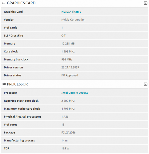 Модуль SystemInfo приложения 3DMark определил, что Molletitsolution разогнал свою карту TITAN V с 1200 до 1995 МГц, а процессор Intel Core i9-7980XE — с 2600 до 4798 МГц. Старшему Skylake-X для работы на частоте, близкой к 5 ГГц, понадобилось жидкостное охлаждение.