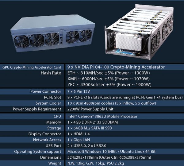 Стоит отметить, что наряду с P104-100 Twin X2 компания Inno3D предлагает целую ферму в сборе, основой которой являются девять ускорителей P104-100 с 4-Гбайт буфером. Радиаторы карт расширения обдуваются десятью 90-мм вентиляторами со скоростью вращения 4800 об/мин. Мощность используемого блока питания составляет 2200 Вт.