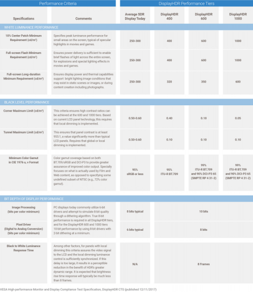 Мониторы с поддержкой расширенного динамического диапазона получат три вида маркировки: DisplayHDR 400, DisplayHDR 600 и DisplayHDR 1000. В общем случае все три значения символизируют максимально достижимую яркость экрана в кд/м2. Данные спецификации DisplayHDR версии 1.0 предназначены для оценки исключительно жидкокристаллических панелей для разнообразного компьютерного применения. Позже будет добавлена поддержка LCD иного назначения, включая телевизионную технику, и дисплеи на панелях OLED.