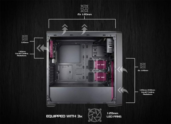 Новинка наделена двумя отсеками для 5,25-дюймовых устройств. Внутри есть место для двух накопителей в форм-факторе 3,5/2,5 дюйма и ещё для четырёх 2,5-дюймовых устройств хранения данных.