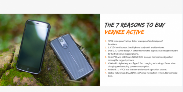 Помимо базовых характеристики, присущих всем защищённым телефонам, смартфон Vernee Active имеет в активе восьмиядерный процессор Helio P25 с 6 Гбайт оперативной памяти и флеш-накопителем ёмкостью 128 Гбайт, 5,5-дюймовый дисплей производства Japan Display, изготовленный по технологии InCell, с разрешением Full HD (1920 ? 1080 точек), сканер отпечатков пальцев, универсальный разъём USB Type-C и т. д. Всё это является весомым аргументом в пользу приобретения Vernee Active.
