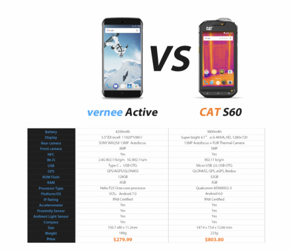Ещё интереснее провести сравнение Vernee Active и CAT S60, включая спецификации и цену. Даже если отбросить спецификации, Vernee Active выглядит лучше, а цена его заметно ниже. Какой из них вы выберете?