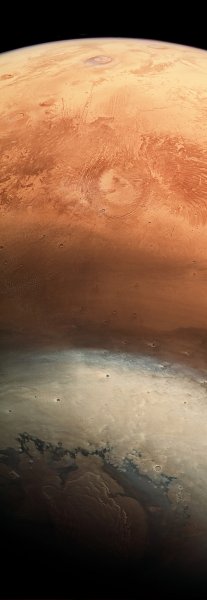 На представленном изображении северный полюс Марса находится внизу, а экватор — вверху. Фото сделано во время калибровки бортовой камеры. На снимке прекрасно видны ледяные покровы Красной планеты, а также особенности ландшафта.