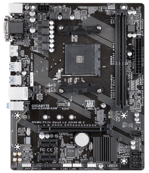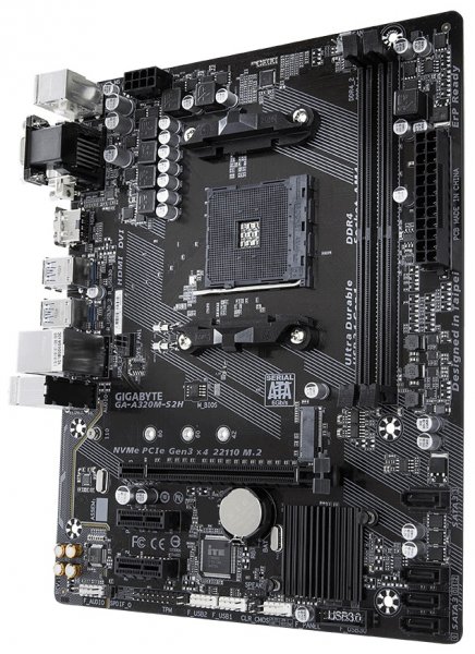 Модель GA-A320M-S2H располагает двумя разъёмами для оперативной памяти DDR4-2133/…/3200 с поддержкой до 32 Гбайт RAM, слотом M.2 Key M (32 Гбайт/с) для SSD-накопителей длиной до 110 мм, шестью портами SATA 6 Гбит/с с опцией построения RAID-массивов уровней 0, 1 и 10, парой слотов PCI Express 2.0 x1 и единичным PCI Express 3.0 x16 для карт расширения. Контроллеры Realtek отвечают за работу интерфейса проводной сети 10/100/1000 Мбит/с и 8-канальной аудиоподсистемы. Из этого дуэта известна только маркировка аудиокодека — ALC887.
