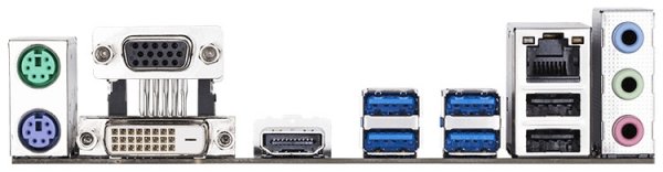 Конфигурация задней панели I/O придётся по вкусу владельцам «раритетных» комплектующих: на неё выведены разъёмы PS/2 для мыши и клавиатуры, видеовыходы D-Sub, DVI-D и HDMI, четыре порта USB 3.0, единичный RJ-45, пара USB 2.0 и три гнезда Mini-Jack.