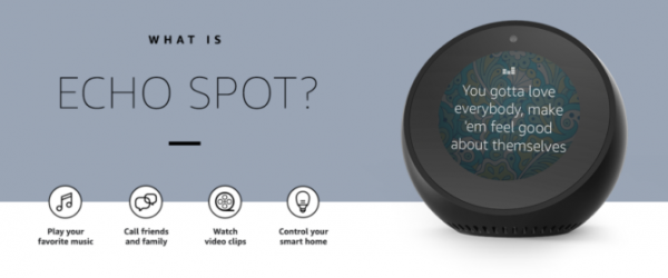Amazon Echo Spot — компактное устройство с динамиком, круглым 2,5-дюймовым экраном, фронтальной камерой, массивом из четырёх микрофонов и полной интеграцией в экосистему Alexa Amazon. Это означает, что, как и большинство других устройств Echo Amazon, вы можете использовать его для управления всем оборудованием в вашем «умном» доме или интеграции с помощью «навыков» с другими приложениями и сервисами. Хотя Amazon не рекламировала Echo Spot в качестве смарт-будильника, в большинстве обзоров указывают на возможность применения устройства именно в этом качестве.